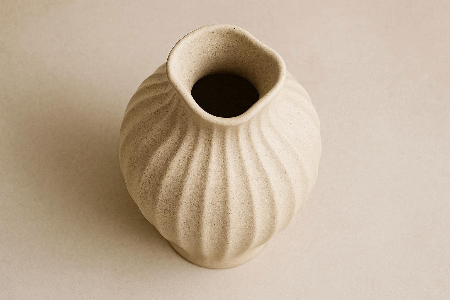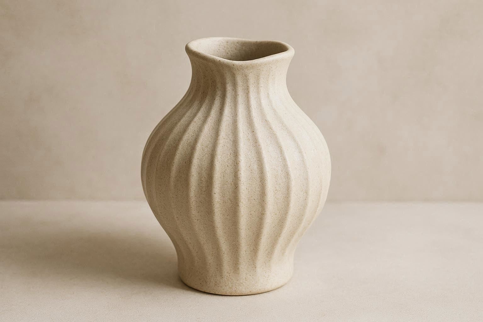 Finished in earthy, muted glazes such as olive green, sand, or oatmeal, it highlights the texture and embodies a serene, organic aesthetic. The vase is crafted from stoneware clay, making it sturdy and durable for everyday use. Its weighted bottom provides good stability despite its free form shape.