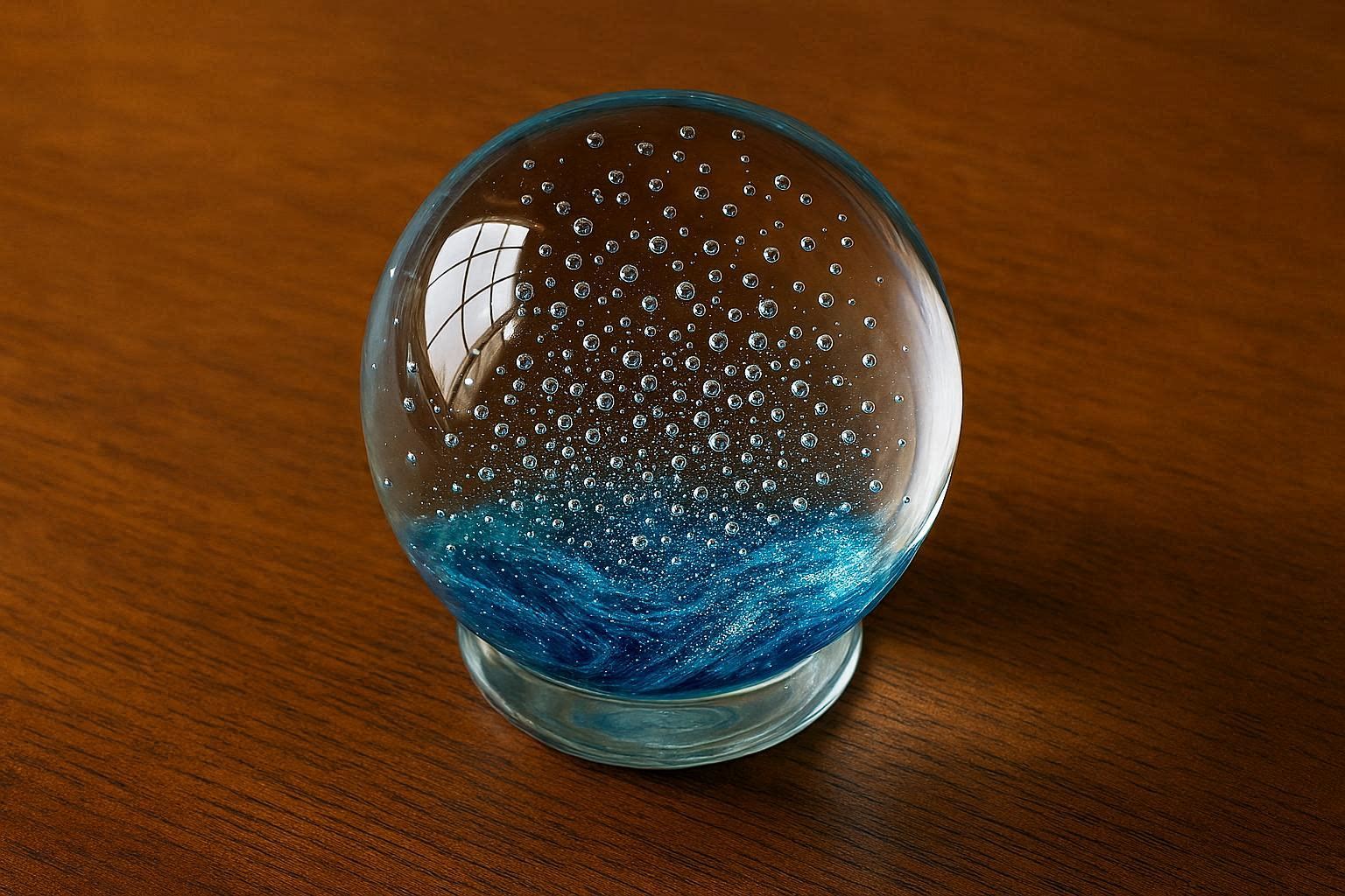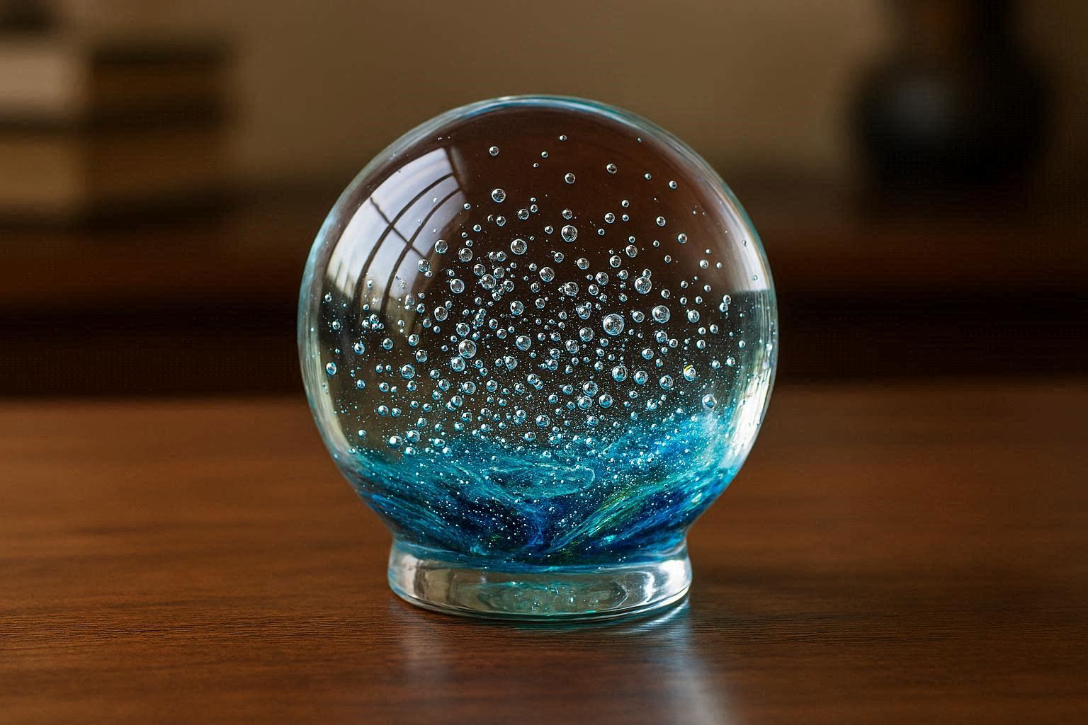 This exquisite paperweight features a hand blown glass crystal ball with a mesmerizing swirl of silver and blue inside. It measures 3 inches in diameter and has a substantial, smooth feel. The clear glass captures and reflects light beautifully, creating a calming and magical atmosphere on any desk or study table.