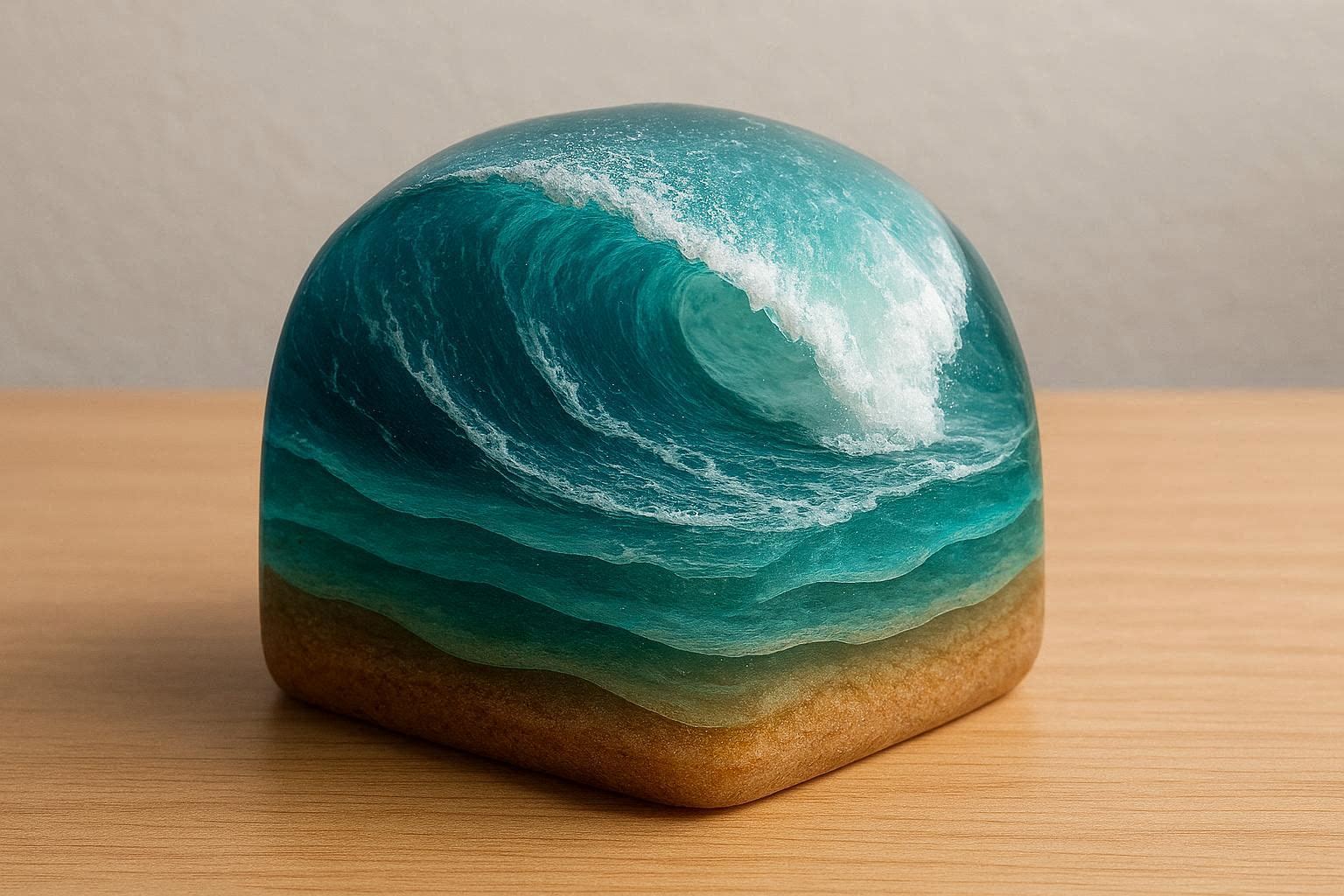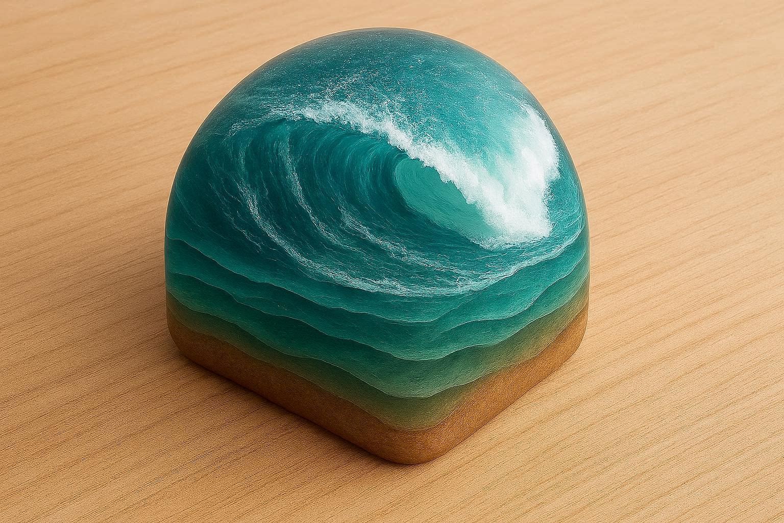 Capturing the eternal motion of the sea, this stunning paperweight is made from layers of hand poured, colored resin to create a realistic 3D wave effect. It measures 4 inches by 3 inches and is about 1.5 inches thick with a smooth, polished surface. The deep blues and white crest details are mesmerizing.