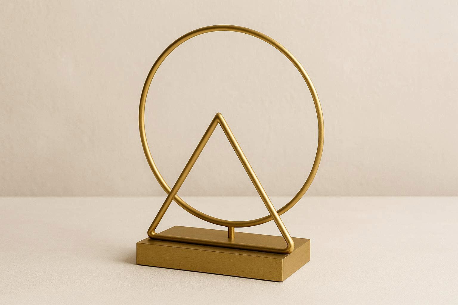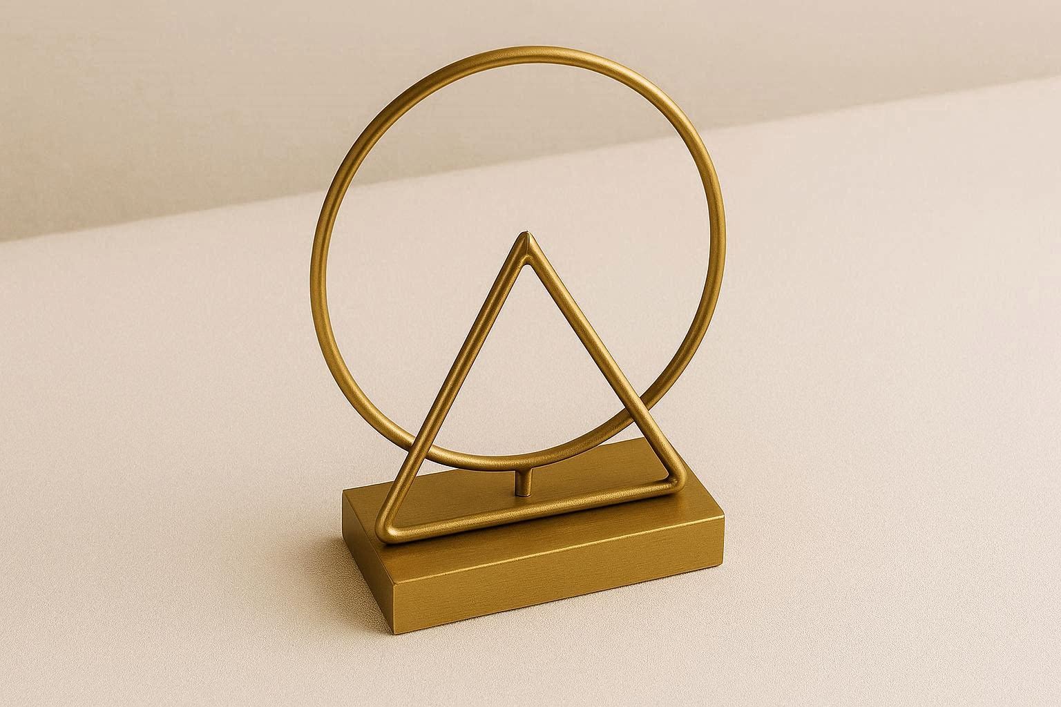 This elegant sculpture is crafted from solid brass with a polished finish that resists tarnishing. Its abstract geometric design measures 4.5 inches in height and serves as a striking visual focal point. The piece is weighted for stability and complements modern, Scandinavian, or industrial interior styles beautifully.